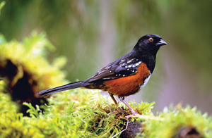 • Eastern Towhees return to scratch around under bird feeders. They can be heard and seen dashing in and out of low brushy thickets, but prefer to sing from higher and more open perches. -