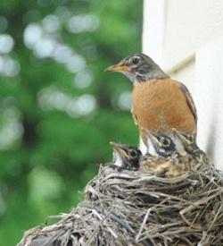 • Robins typically nest April through July and can bear 2-3 broods in a season. The female does most of the nest building. Put out a pan of mud and nesting materials and watch her collect materials to make her nest