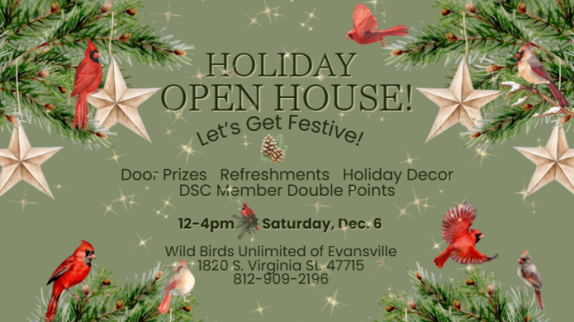 You are invited to a festive afternoon! Please join us for our Holiday Open House - we'll be decorated for the holidays & full of the holiday spirit. Enjoy refreshements, enter-to-win one of two prizes, and DSC Members will receive double points on all their purchases. Holiday decorations for every nature lover will be available to purchase as well as grab'n'go prewrapped gifts. Come get festive with us!